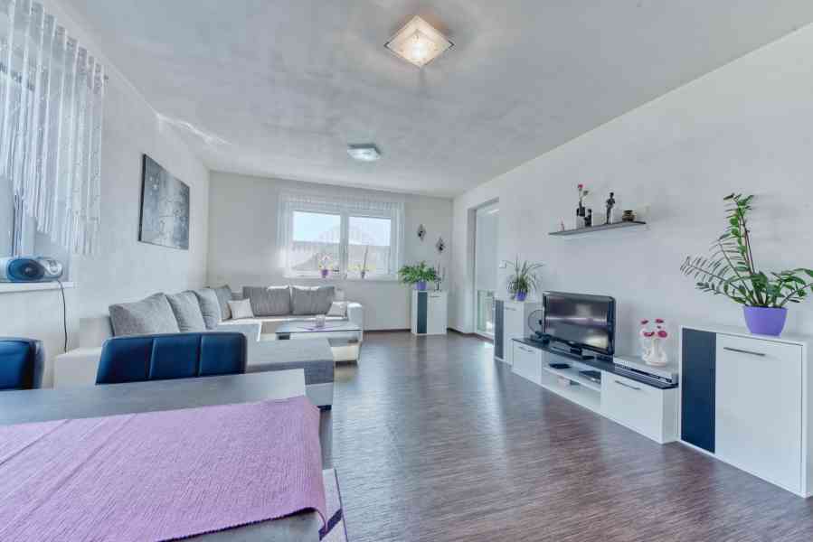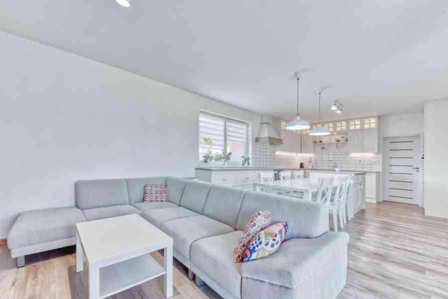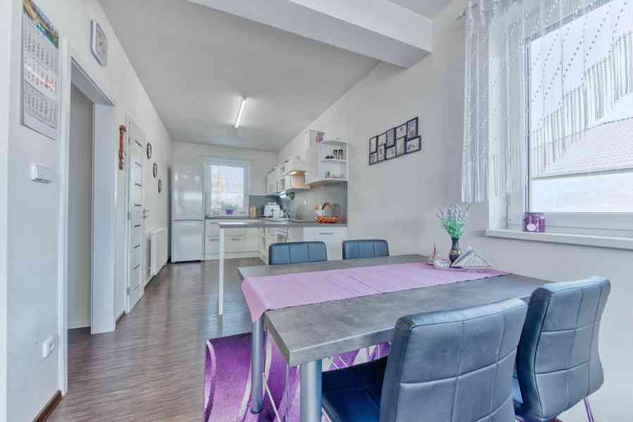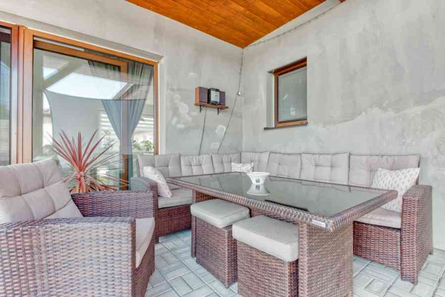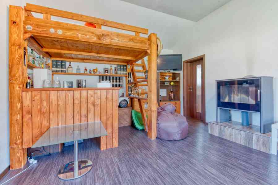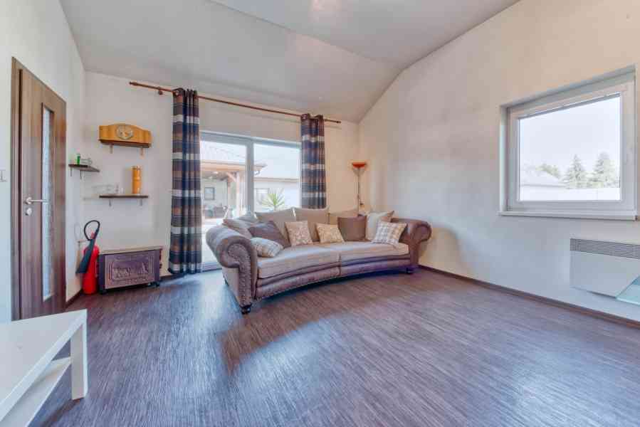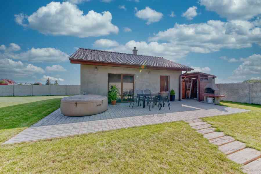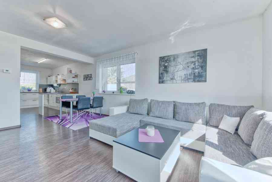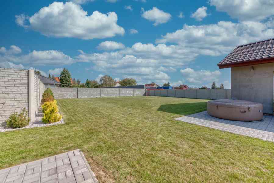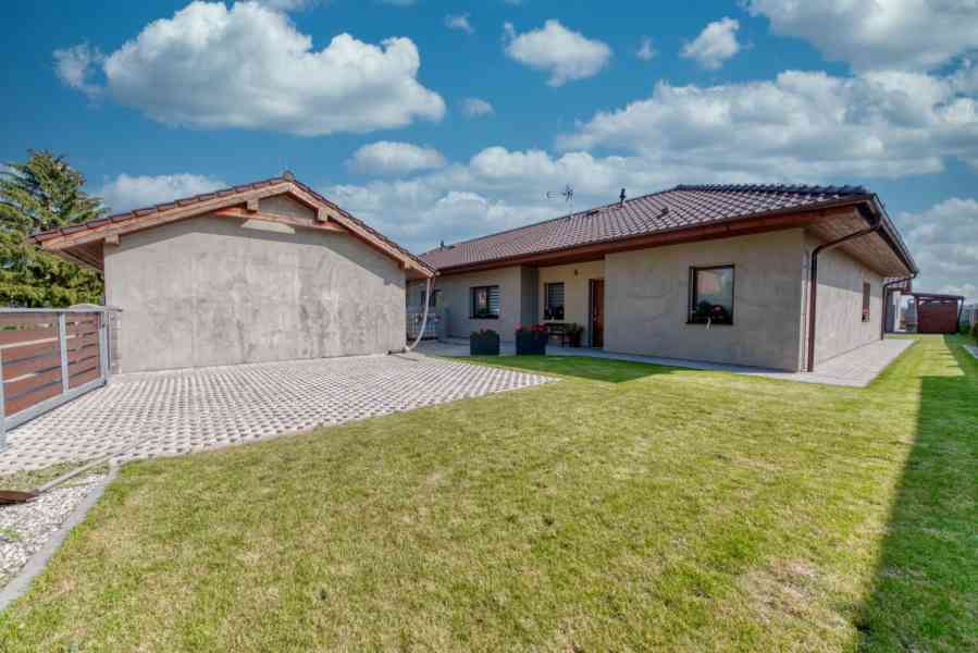 Levá bytová jednotka (LBJ) disponuje menší zahradou cca 250 m2 - pravá bytová jednotka (PBJ) má zahradu cca 750 m2, zde se zároveň nachází třetí bytová jednotka a to v samostatném domě pro hosty o velikosti 45 m2, s vlastní koupelnou a toaletou. Každá bytová jednotka má vstup z obývacího pokoje na zastřešenou terasu, kde se nachází venkovní posezení. PBJ - 4+kk o velikosti 106 m2 (ložnice se šatnou, dva dětské pokoje, koupelna se sprchovým koutem a vanou, samostatné WC s umyvadlem, technická místnost, kuchyně propojená s obývacím pokojem ) vše je spojeno centrální chodbou, pokoje jsou neprůchozí. Dům je vytápěn plynovým kotlem GEMINOX, který je napojený na podlahové topení a ohřev vody. V celém domě je instalována vinylová podlaha a kompletní nábytek dělaný na zakázku (3x vestavěné skříně, postel s nočními stolky, šatna, kuchyně). V kuchyni jsou instalovány spotřebiče značky Whirpool a to konkrétně: - vestavěná lednice s mrazákem - samostatný mrazák - indukční deska - trouba - mikrovlná trouba - myčka - klimatizace. LBJ - 3+kk o velikosti 94 m2 (2x pokoj, koupelna se sprchovým koutem, vanou a toaletou, samostatné WC s umyvadlem, technická místnost, kuchyně a malá spíš navazují na obývací pokoj) vše spojeno centrální chodbou, pokoje jsou neprůchozí. Dům je vytápěn plynovým kotlem GEMINOX, který je napojený na podlahové topení a ohřev vody. v Celém domě je instalováno linoleum. Kuchyně dělaná na zakázku se spotřebiči značky Mora.