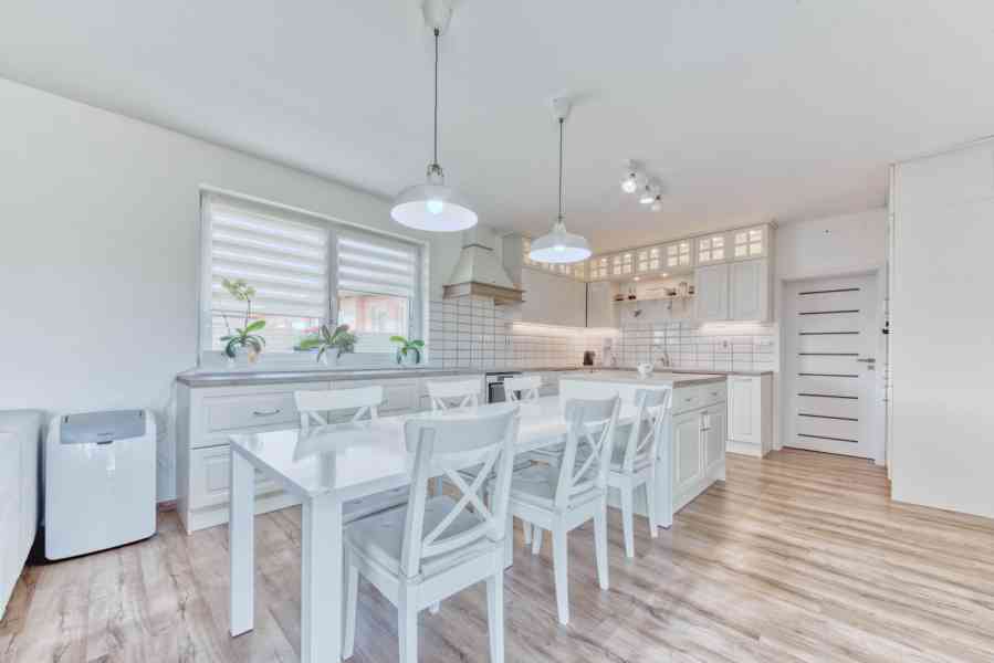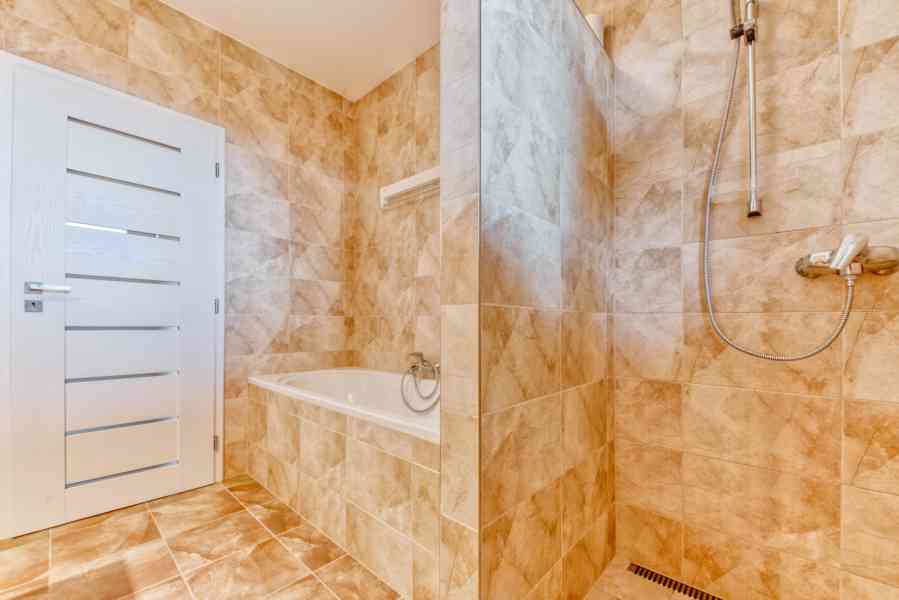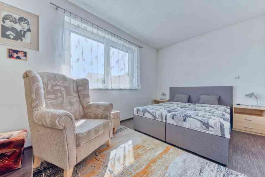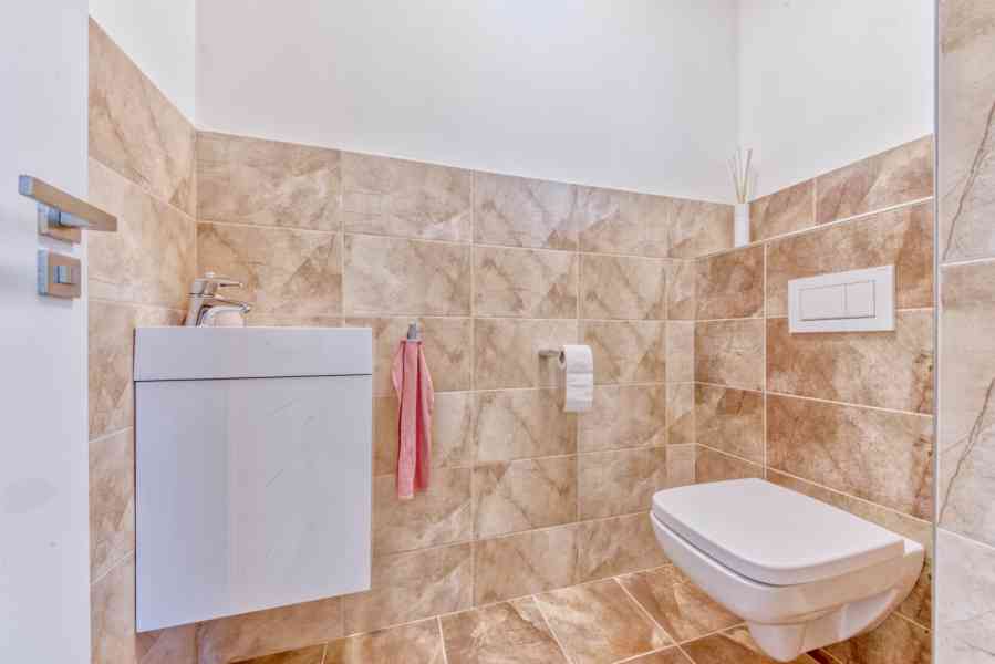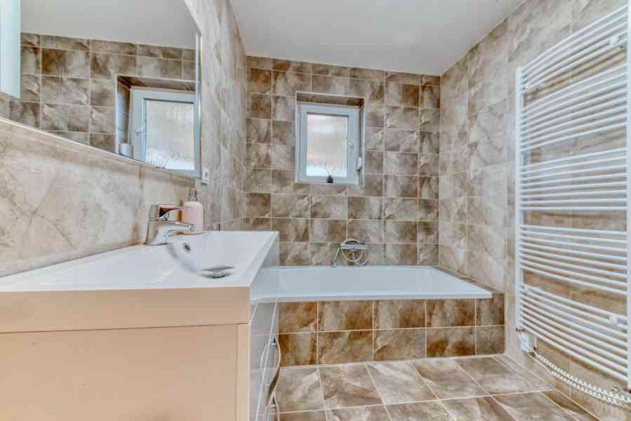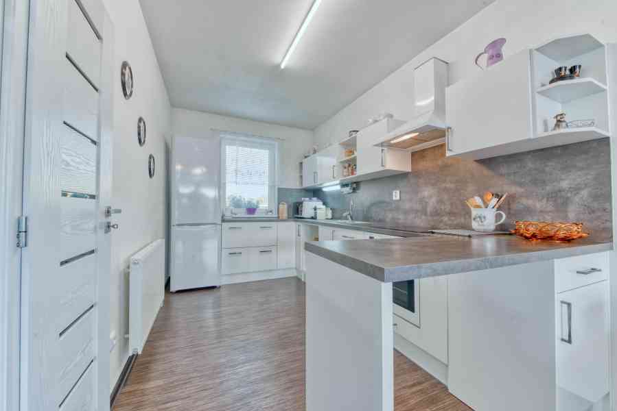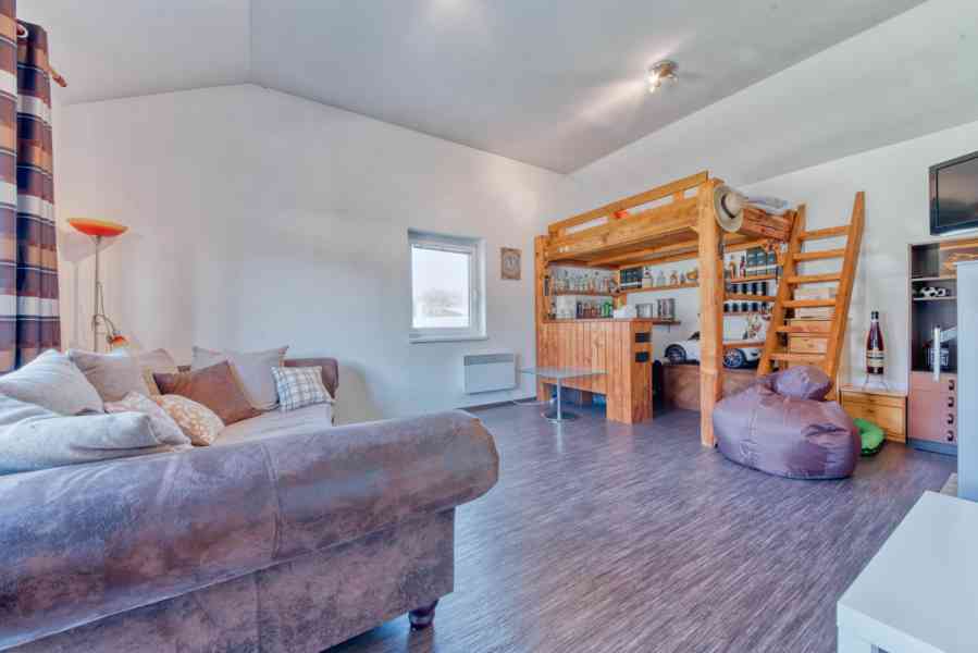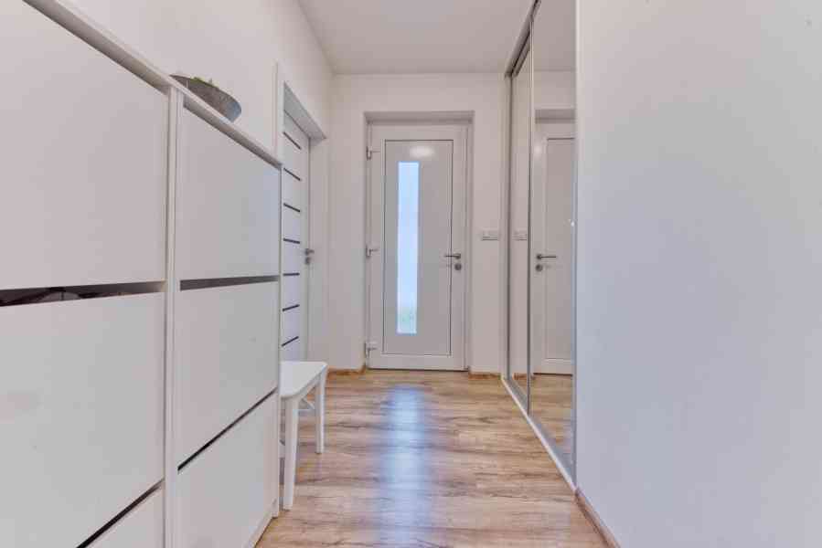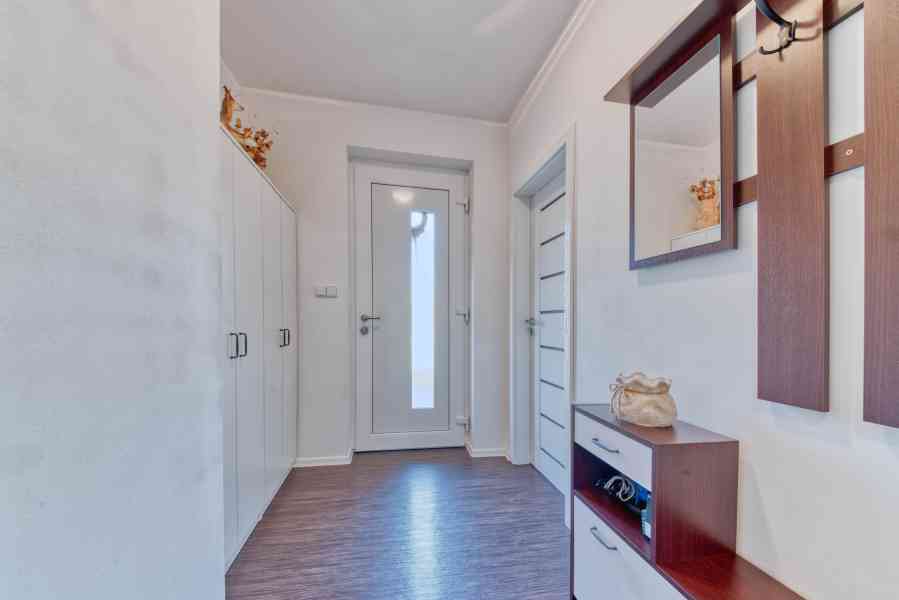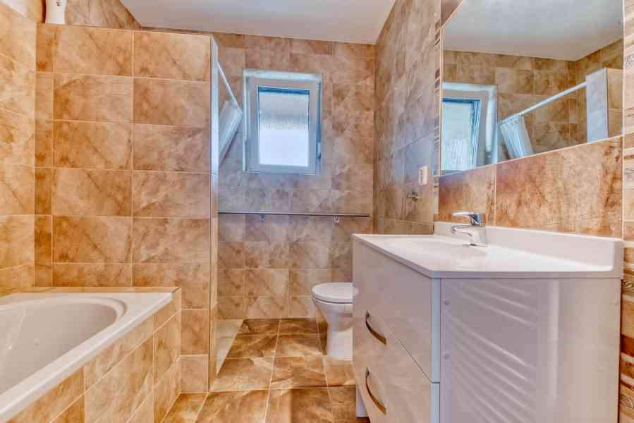 Levá bytová jednotka (LBJ) disponuje menší zahradou cca 250 m2 - pravá bytová jednotka (PBJ) má zahradu cca 750 m2, zde se zároveň nachází třetí bytová jednotka a to v samostatném domě pro hosty o velikosti 45 m2, s vlastní koupelnou a toaletou. Každá bytová jednotka má vstup z obývacího pokoje na zastřešenou terasu, kde se nachází venkovní posezení. PBJ - 4+kk o velikosti 106 m2 (ložnice se šatnou, dva dětské pokoje, koupelna se sprchovým koutem a vanou, samostatné WC s umyvadlem, technická místnost, kuchyně propojená s obývacím pokojem ) vše je spojeno centrální chodbou, pokoje jsou neprůchozí. Dům je vytápěn plynovým kotlem GEMINOX, který je napojený na podlahové topení a ohřev vody. V celém domě je instalována vinylová podlaha a kompletní nábytek dělaný na zakázku (3x vestavěné skříně, postel s nočními stolky, šatna, kuchyně). V kuchyni jsou instalovány spotřebiče značky Whirpool a to konkrétně: - vestavěná lednice s mrazákem - samostatný mrazák - indukční deska - trouba - mikrovlná trouba - myčka - klimatizace. LBJ - 3+kk o velikosti 94 m2 (2x pokoj, koupelna se sprchovým koutem, vanou a toaletou, samostatné WC s umyvadlem, technická místnost, kuchyně a malá spíš navazují na obývací pokoj) vše spojeno centrální chodbou, pokoje jsou neprůchozí. Dům je vytápěn plynovým kotlem GEMINOX, který je napojený na podlahové topení a ohřev vody. v Celém domě je instalováno linoleum. Kuchyně dělaná na zakázku se spotřebiči značky Mora.